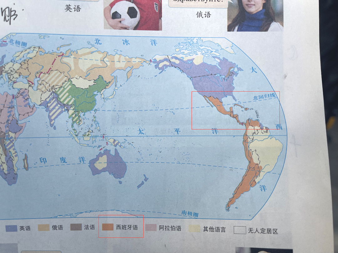该书第43页的世界地图中,海地所在位置及周围的一些国家都被标为了橙色的“西班牙语”区。