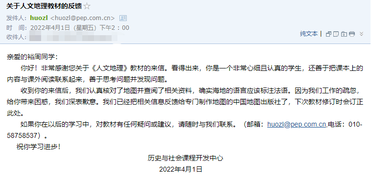 在妈妈的鼓励下,他给出版社写了一封邮件,并很快得到了回复。出版社表示下次教材修订时会订正错误。