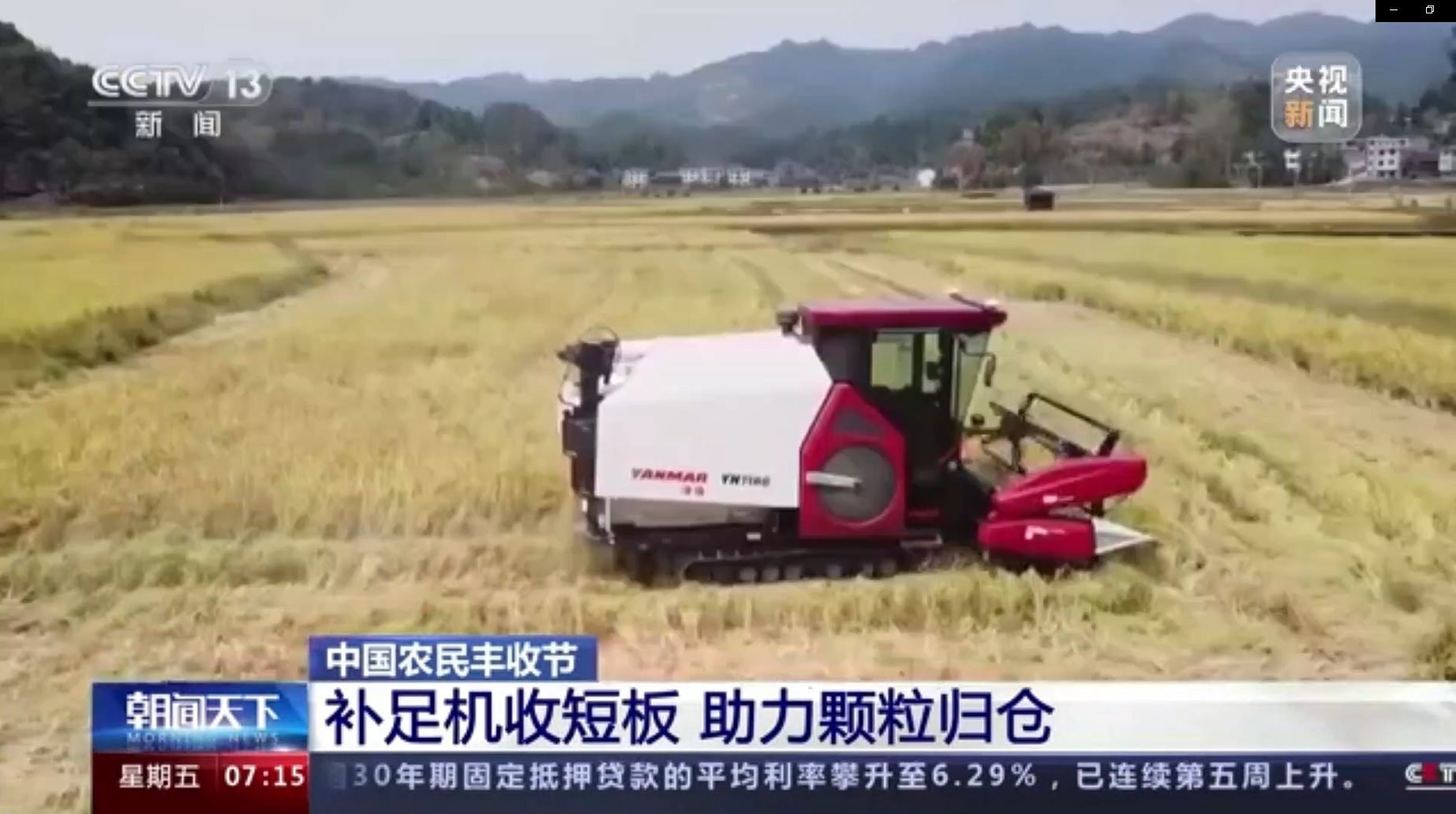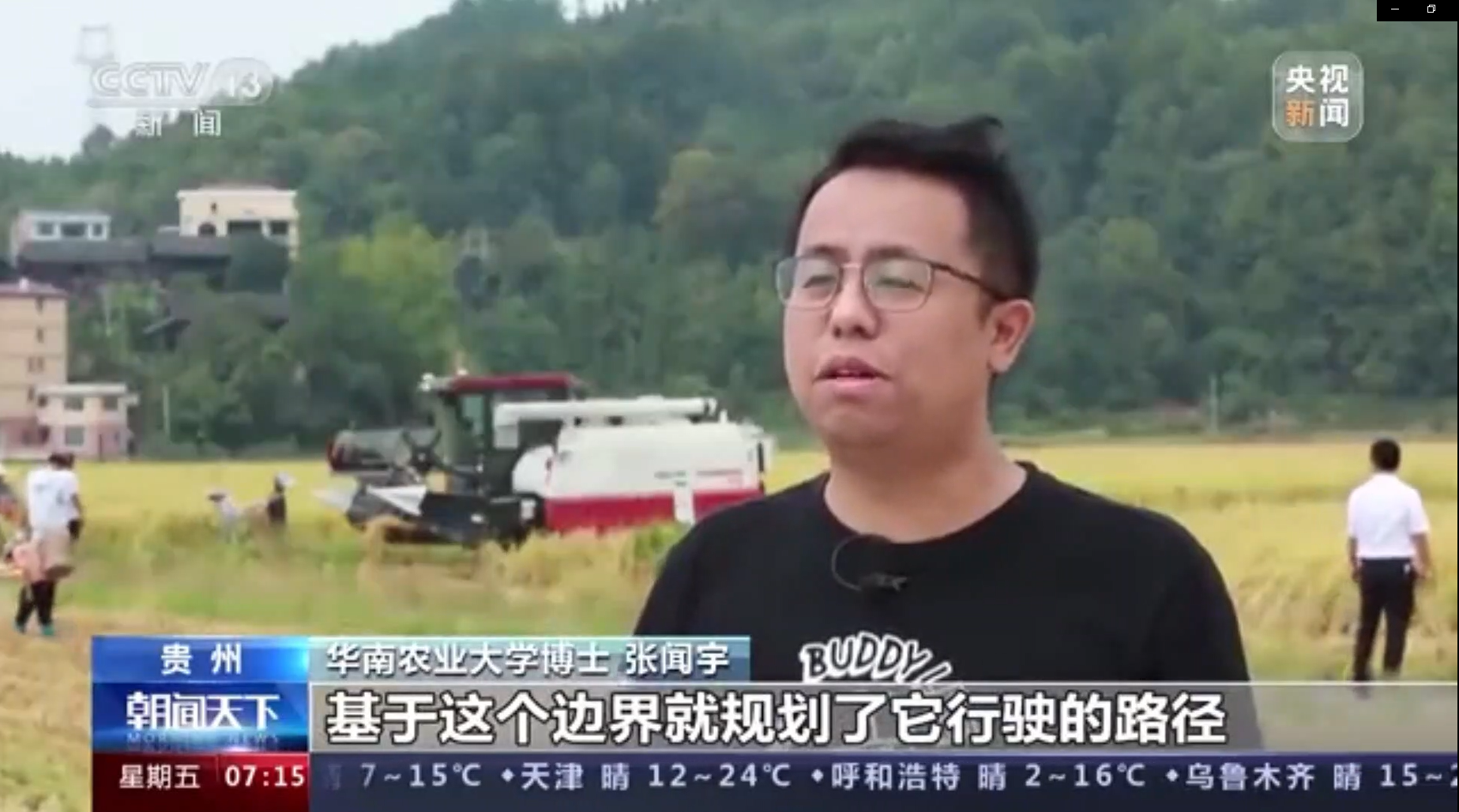 今天(9月23日),央视新闻频道《朝闻天下》播出了新闻《【中国农民丰收节】补足机收短板 助力颗粒归仓》。报道了在贵州剑河县南明镇的450亩无人农场示范基地里,技术人员正通过手机远程遥控指挥无人收割机完成水稻收割、拖地、装车的全程无人化作业。
