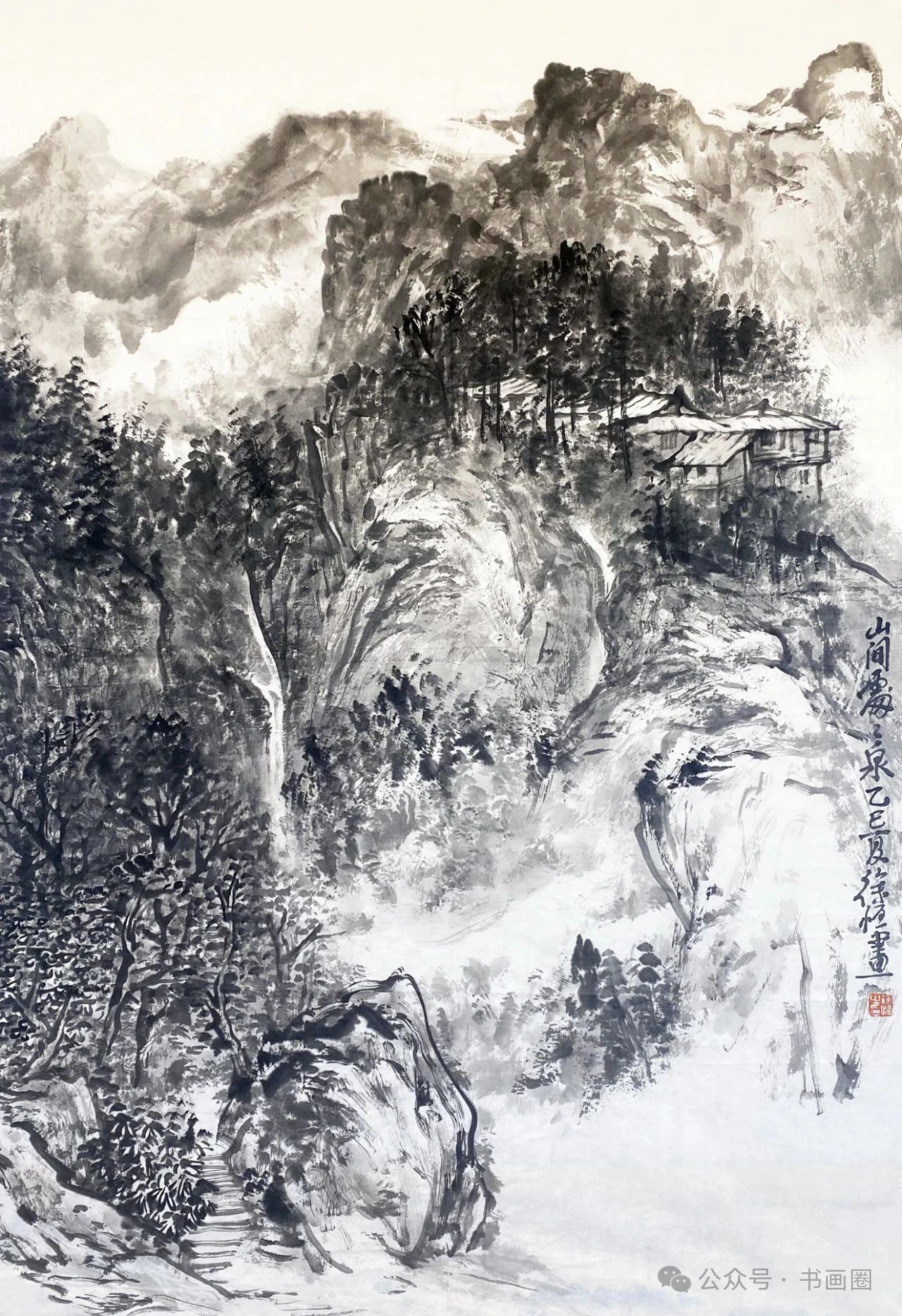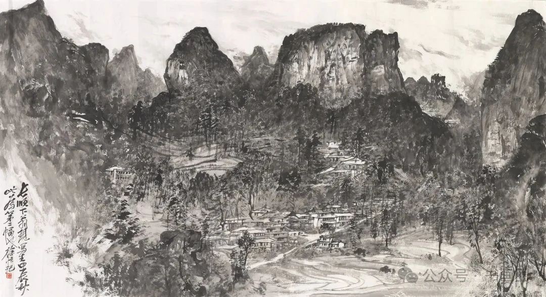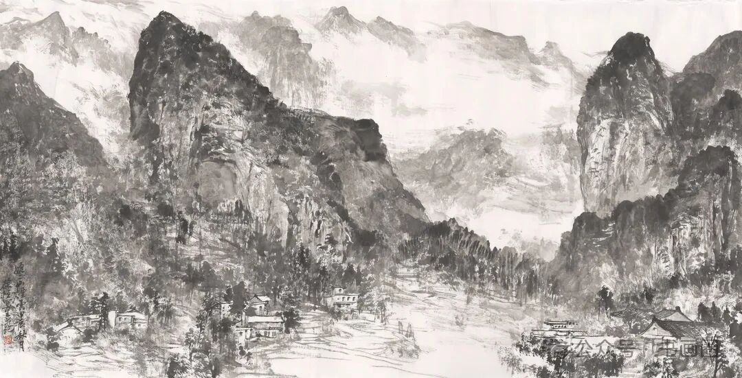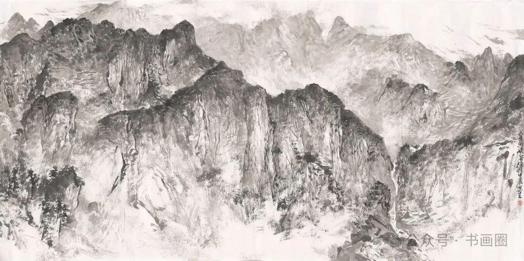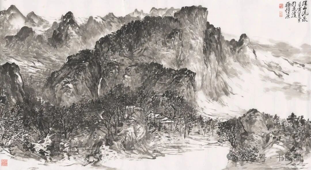 《家在群山峻岭烟云中》 180cmx97cm 2023年徐恒的山水画以水墨为主要表现形式,展现出独特的艺术风格。画面多呈现山川景致,运用浓淡不一的墨色,勾勒、皴擦出山峰的形态,有的画作中云雾缭绕,增添了山水的朦胧意境与悠远气韵,使山峰若隐若现,富有层次感。