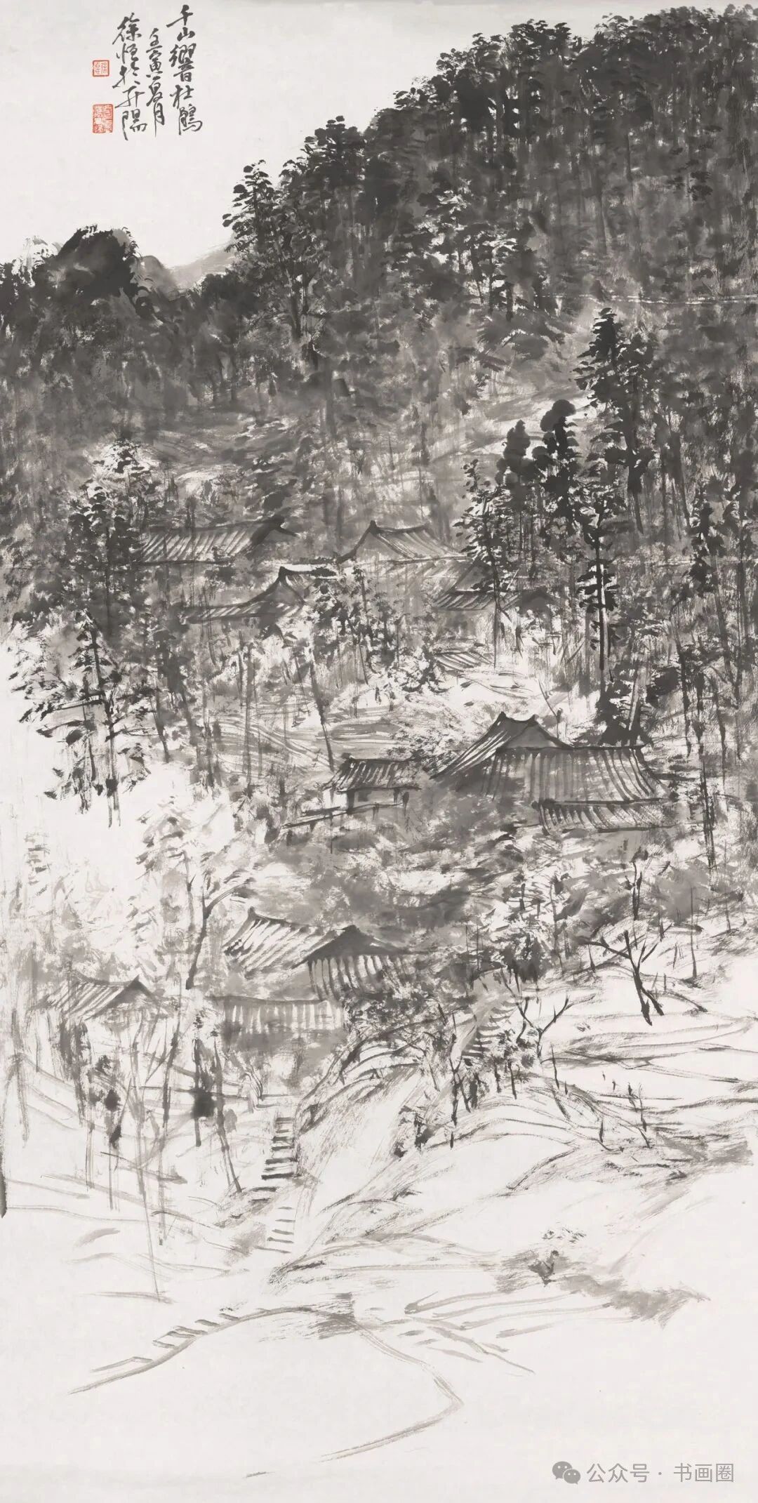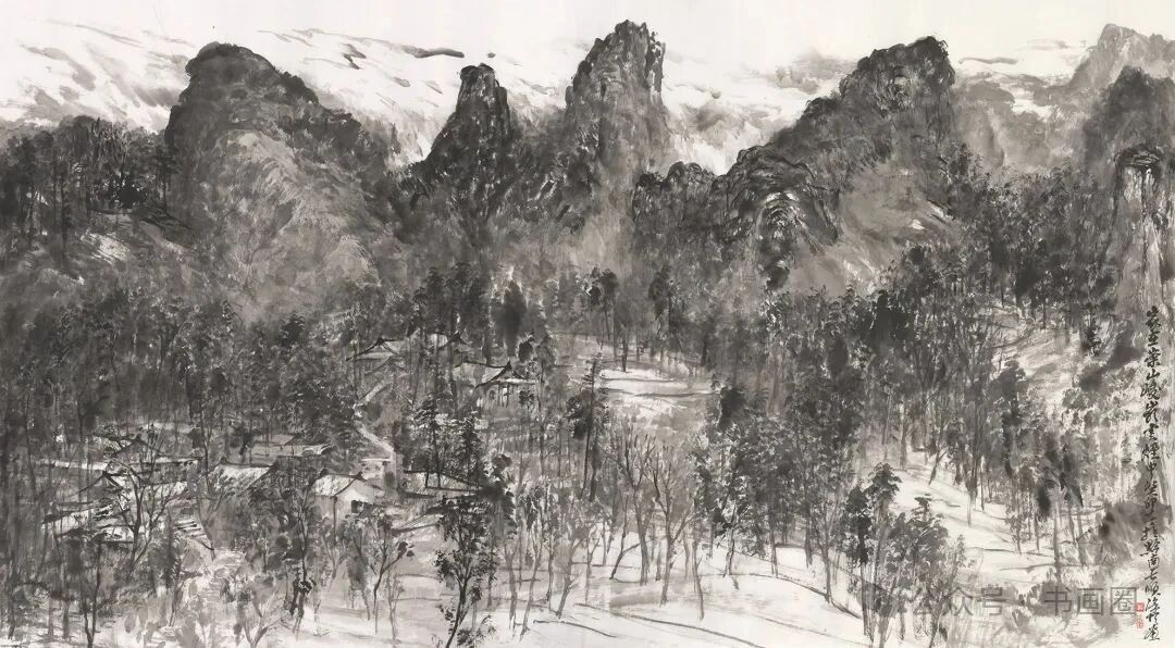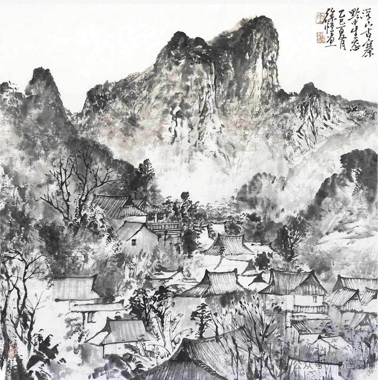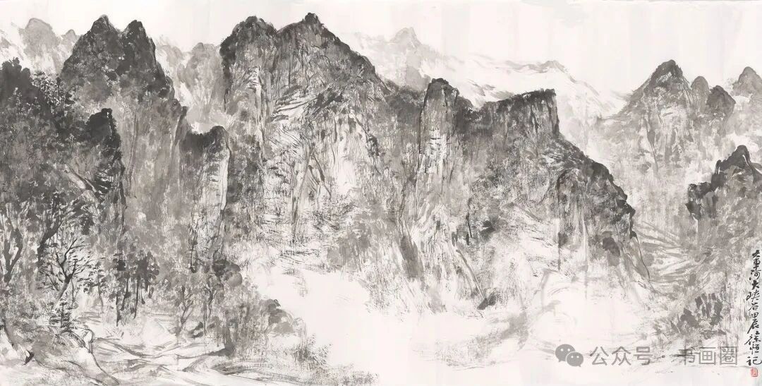 《家在群山峻岭烟云中》 180cmx97cm 2023年徐恒的山水画以水墨为主要表现形式,展现出独特的艺术风格。画面多呈现山川景致,运用浓淡不一的墨色,勾勒、皴擦出山峰的形态,有的画作中云雾缭绕,增添了山水的朦胧意境与悠远气韵,使山峰若隐若现,富有层次感。