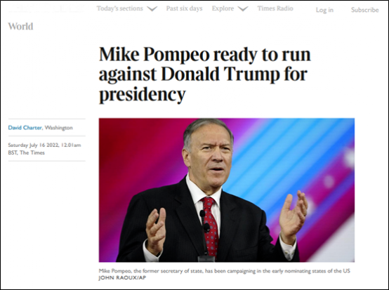 而关于"和特朗普竞争"的消息,《泰晤士报》称消息源来自蓬佩奥身边的一位"知情人士"。另一则消息源提到,特朗普将在11月的中期选举前宣布自己参加2024年大选的消息,但蓬佩奥则决定在中期选举后做出最终决定。