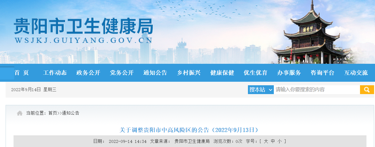 根据当前疫情防控形势,为快速有效阻断疫情传播,实现科学精准防控,切实保障辖区内群众生命安全和身体健康,按照《新型冠状病毒肺炎疫情防控方案(第九版)》相关规定,经省、市专家组研判,自2022年9月13日起,在前期划定的基础上,将贵阳市中高风险区调整如下: