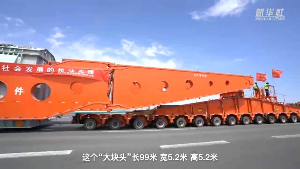 日前,一辆车轮总数多达350个的超大型运输车,搭载着一台±800千伏变压器,从新疆昌吉市出发驶往甘肃酒泉市。这个“大块头”长99米、宽5.2米、高5.2米,车货总重量达737吨,由两个车头牵引、一个车头助推,车辆长度、载重吨位均创新疆大件运输史之最。