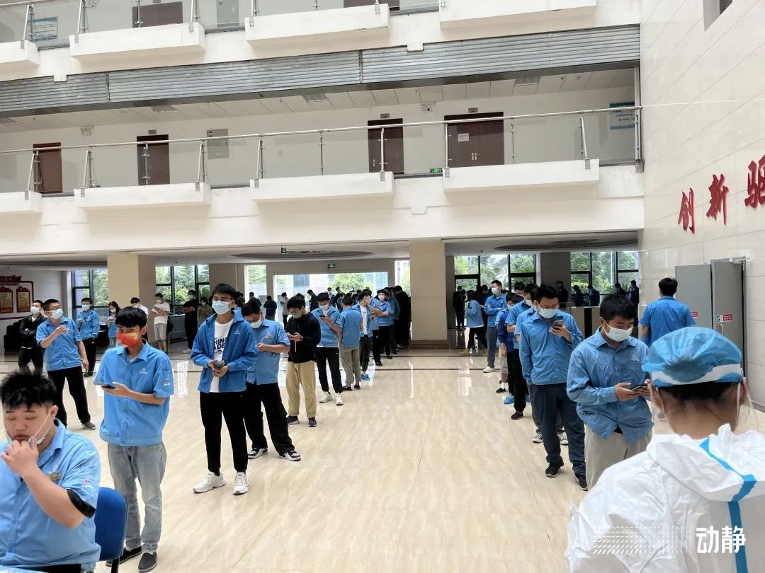 9点30分,核酸检测机构专业人员抵达园区,在抗疫突击队的协助下,对单身公寓和到岗员工有序开展核酸检测。