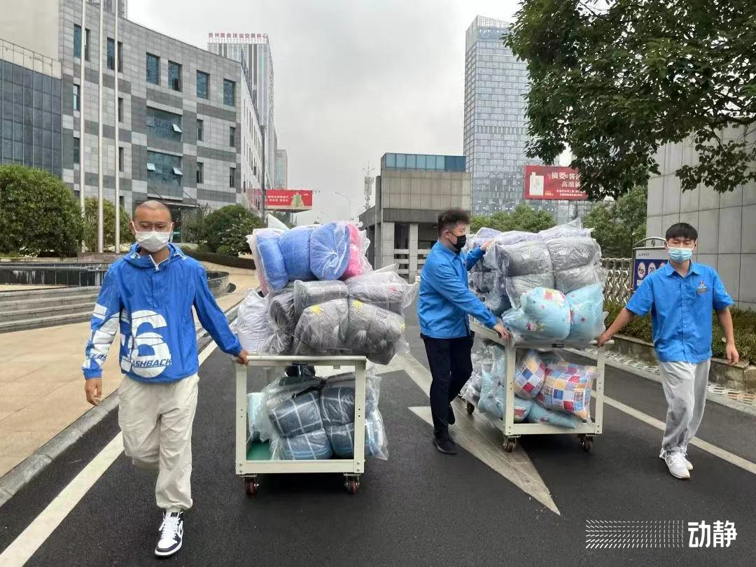 10点至12点,食堂储备的大米、油以及蔬菜等食品,行军床、被褥、牙具等生活保障物资先后顺利到达园区,工作人员完成清点及分发工作。