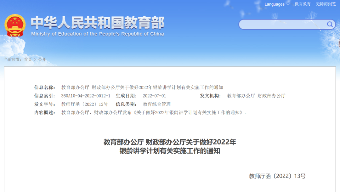 记者7月12日从教育部获悉,教育部办公厅、财政部办公厅日前印发关于做好2022年银龄讲学计划有关实施工作的通知。根据通知,义务教育阶段计划招募5000名讲学教师前往县镇和农村学校工作。