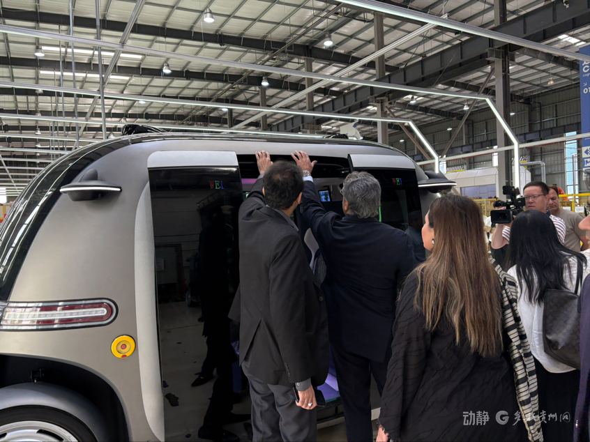 在贵州翰凯斯智能技术有限公司,代表团近距离体验了无人接驳车的智能化运行。代表团还与技术团队进行交流,了解智能环保、无人交通及数据可视化在实际运营中的应用。