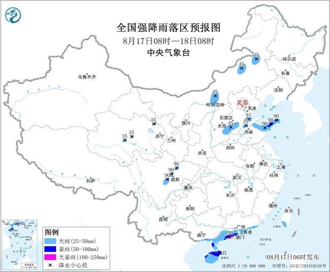 预计,8月17日08时至18日08时,内蒙古中东部、山西东南部、河北南部、山东中北部、青海中北部、四川盆地西部、广西东南部沿海、广东南部沿海、海南岛、台湾岛南部等地部分地区有大到暴雨,其中,广东西南部沿海等地局地有大暴雨(100~150毫米)。上述部分地区伴有短时强降水(最大小时降雨量20~50毫米,局地可超过70毫米),局地有雷暴大风等强对流天气。