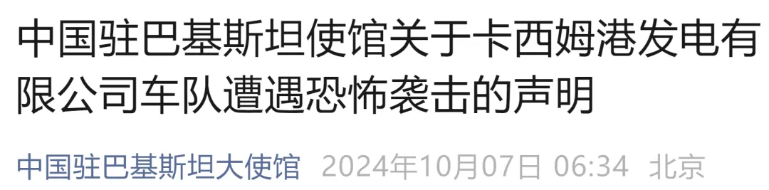 10月6日晚当地时间11时许,中资企业卡西姆港发电有限公司车队在卡拉奇真纳国际机场附近遭遇恐怖袭击。目前已造成2名中方人员遇难、1名中方人员受伤和巴方多名人员伤亡。