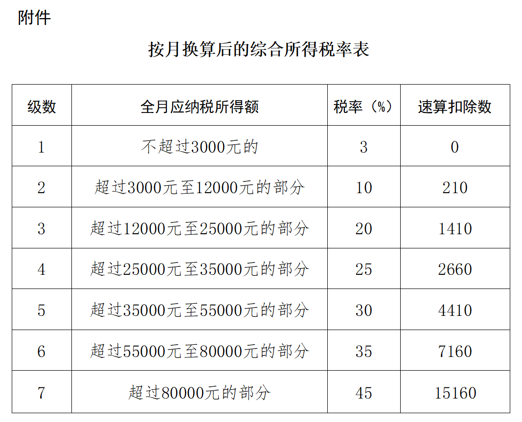 一、居民个人取得全年一次性奖金,符合《国家税务总局关于调整个人取得全年一次性奖金等计算征收个人所得税方法问题的通知》(国税发〔2005〕9号)规定的,不并入当年综合所得,以全年一次性奖金收入除以12个月得到的数额,按照本公告所附按月换算后的综合所得税率表,确定适用税率和速算扣除数,单独计算纳税。计算公式为: