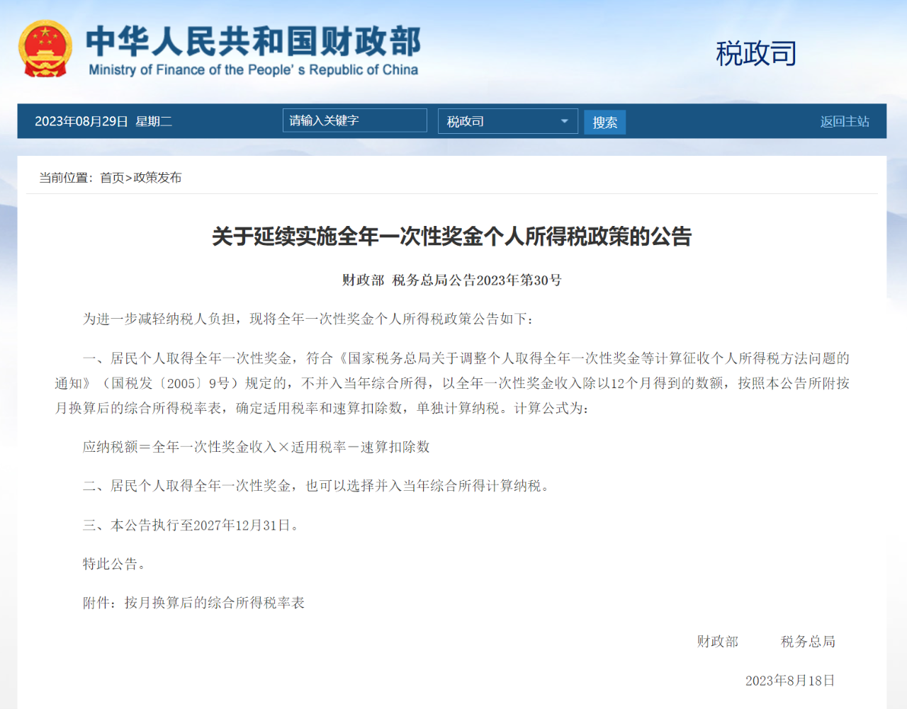 关于延续实施全年一次性奖金个人所得税政策的公告