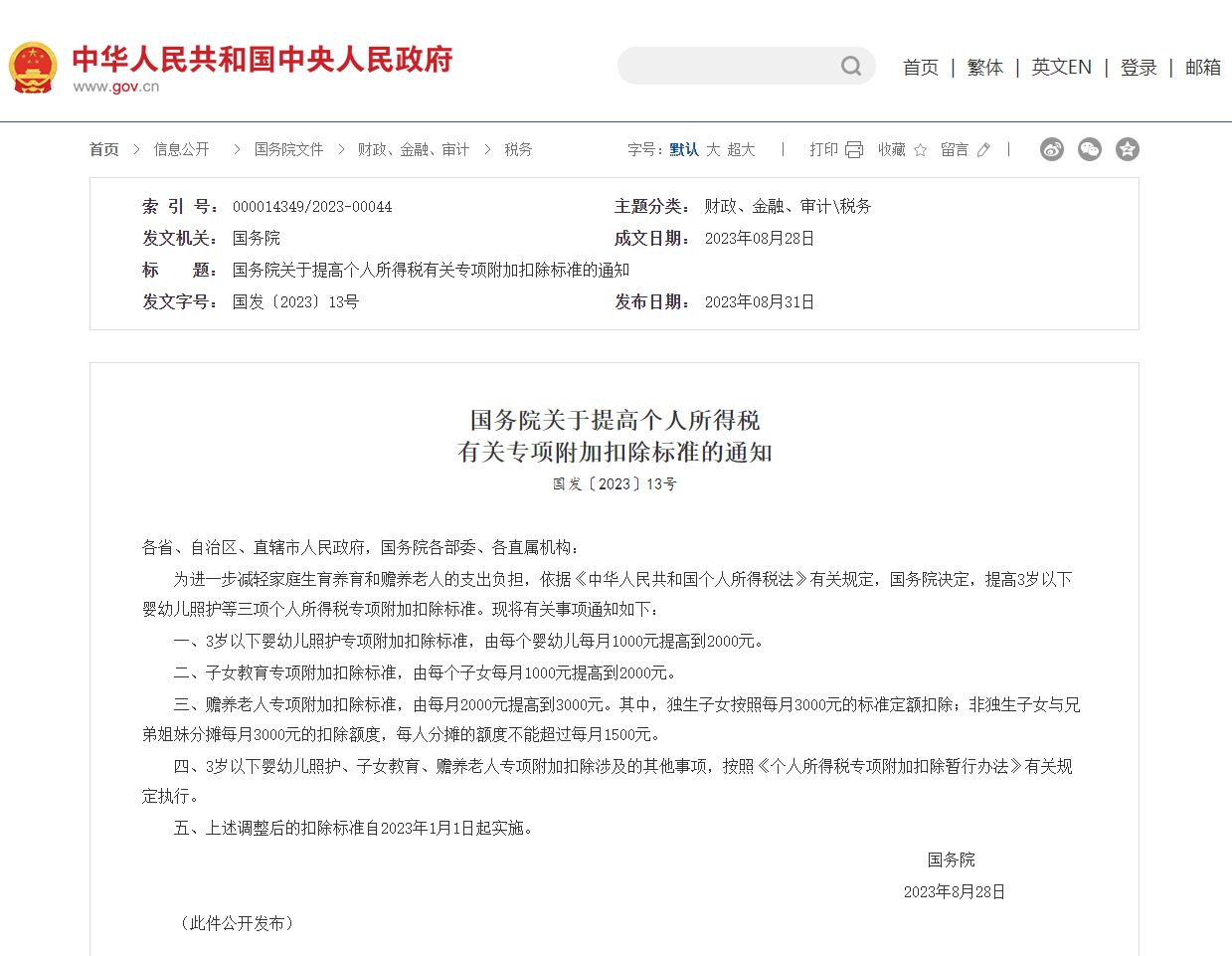 为进一步减轻家庭生育养育和赡养老人的支出负担,依据《中华人民共和国个人所得税法》有关规定,国务院决定,提高3岁以下婴幼儿照护等三项个人所得税专项附加扣除标准。现将有关事项通知如下: