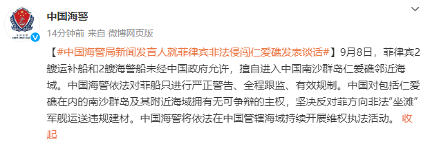 9月8日,菲律宾2艘运补船和2艘海警船未经中国政府允许,擅自进入中国南沙群岛仁爱礁邻近海域。