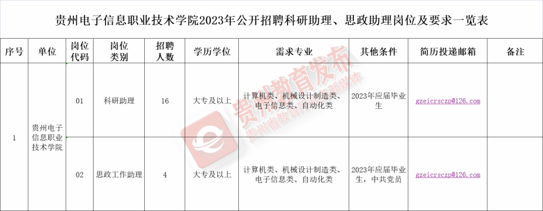 贵州电子信息职业技术学院2023年科研助理、思政助理岗位招聘20人,6月12日至6月14日报名