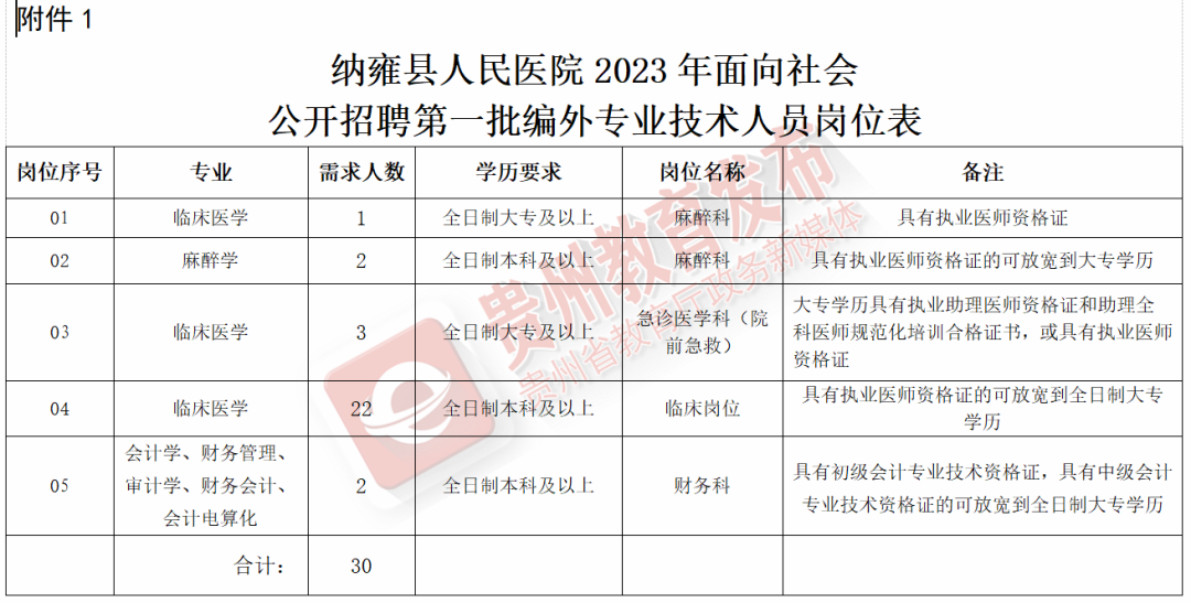 纳雍县人民医院2023年招聘第一批编外专业技术人员30人,6月13-16日报名