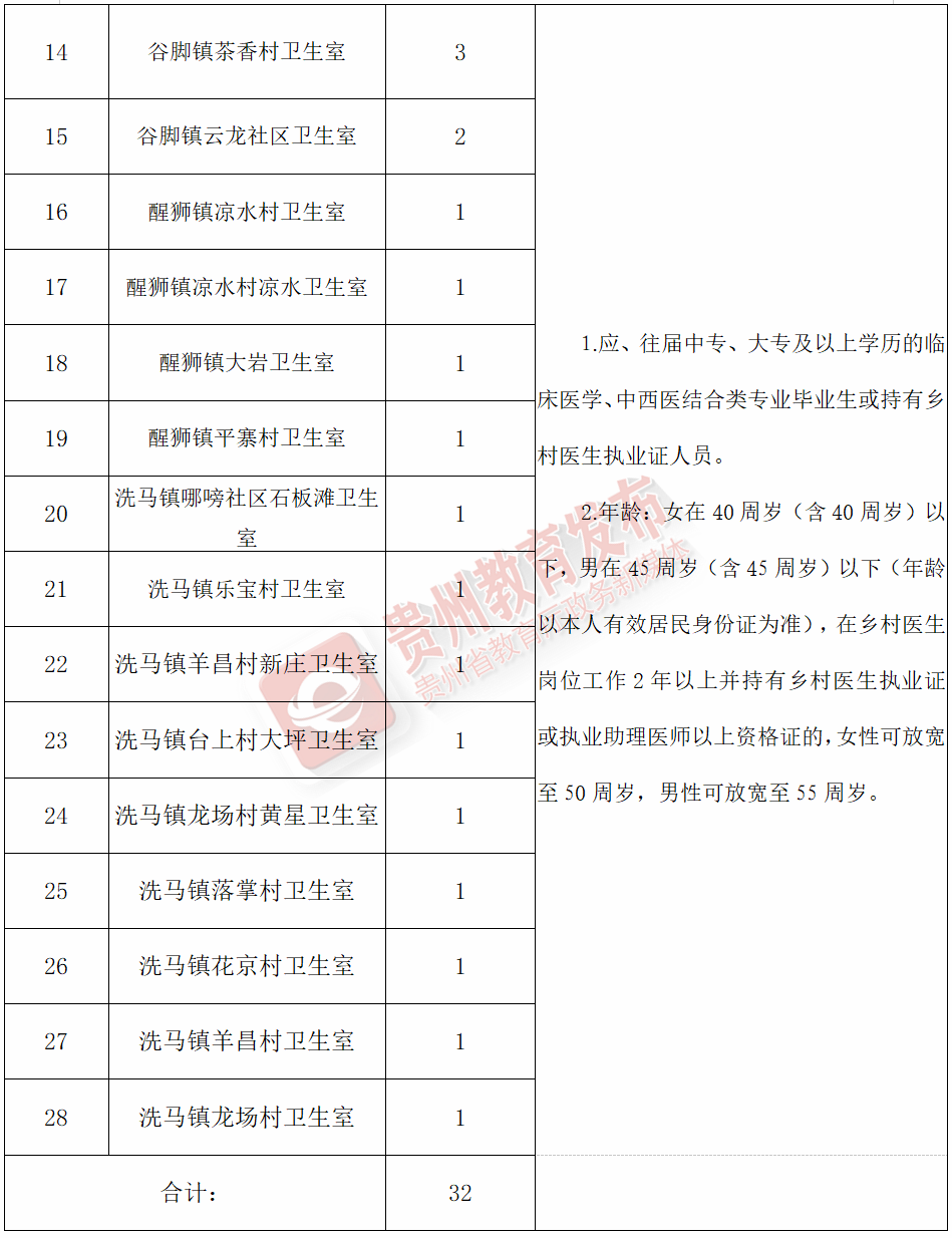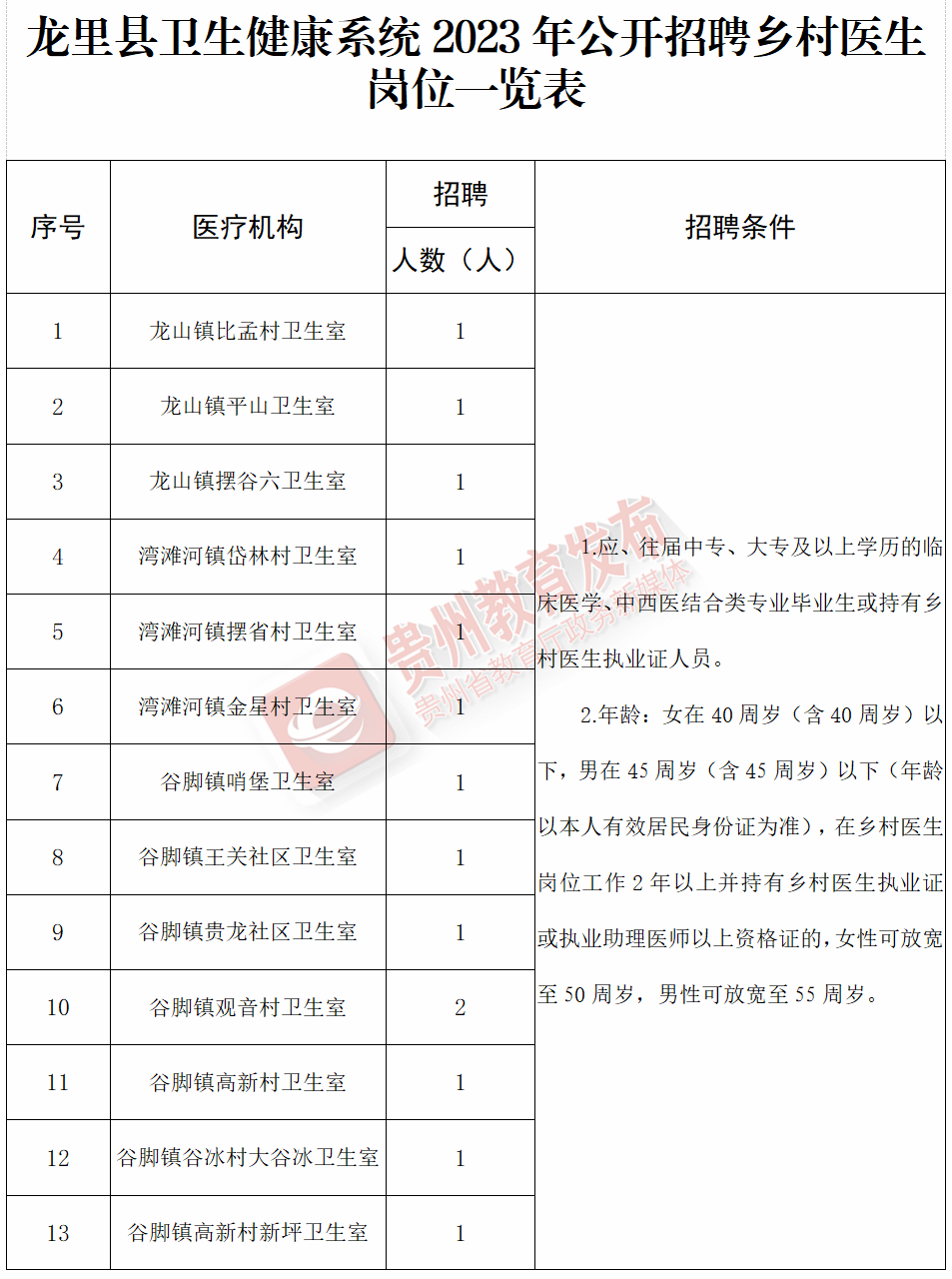 龙里县卫生健康系统2023年公开招聘乡村医生32人,6月12-14日报名