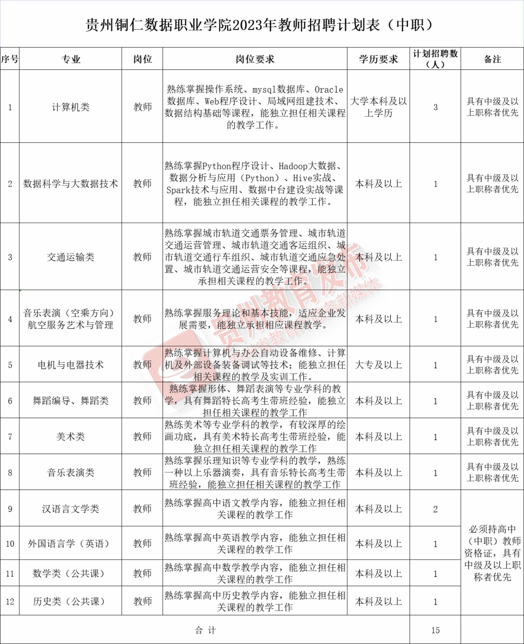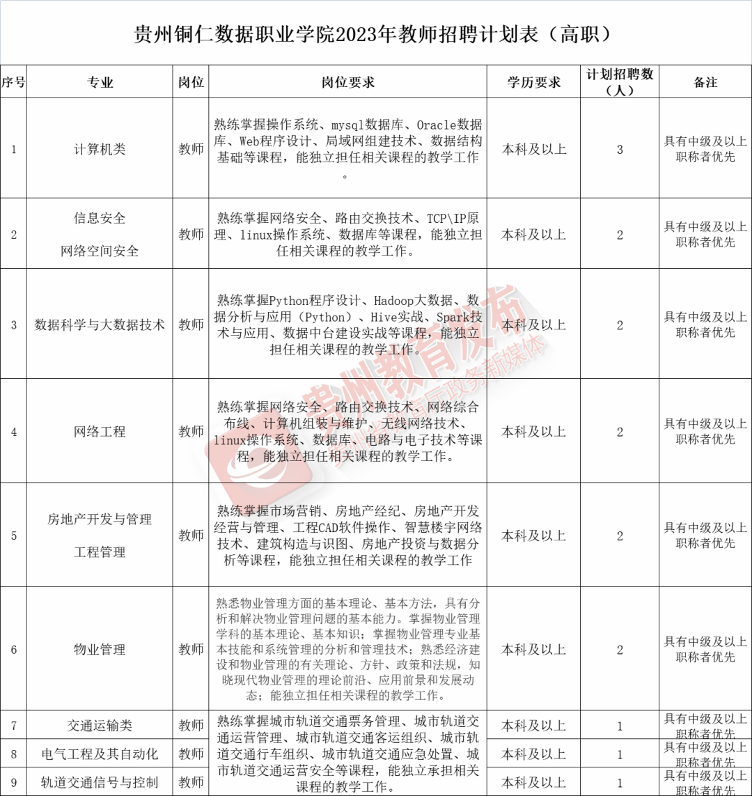 贵州铜仁数据职业学院2023年教师招聘,截至7月1日