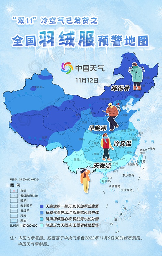 11月12日,冷空气继续向南渗透,需羽绒服出场的区域扩展至江南南部一带。像长沙,12日的最高气温将跌至9℃,是时候穿上羽绒马甲了。内蒙古东部、山西北部、陕西北部及新疆的一些地方随着气温下降,也将天寒地冻一整天,出门需裹紧长款加厚羽绒服。