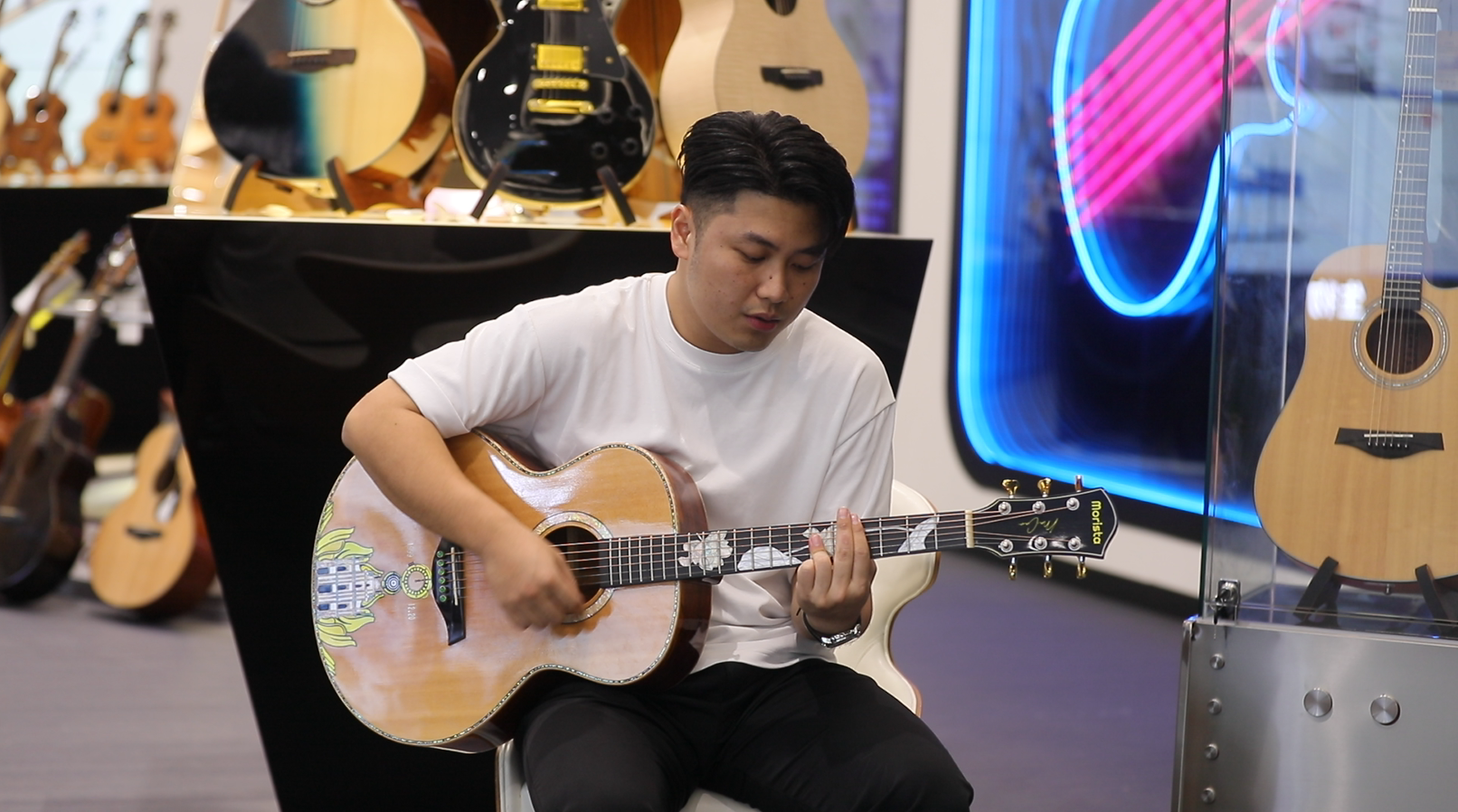 “我刚试了一把全单吉他,木材工艺处理很细致,整体混响非常动听,高频低频层次清晰,演奏起来都非常棒。”演奏完吉他的陈先生赞不绝口。