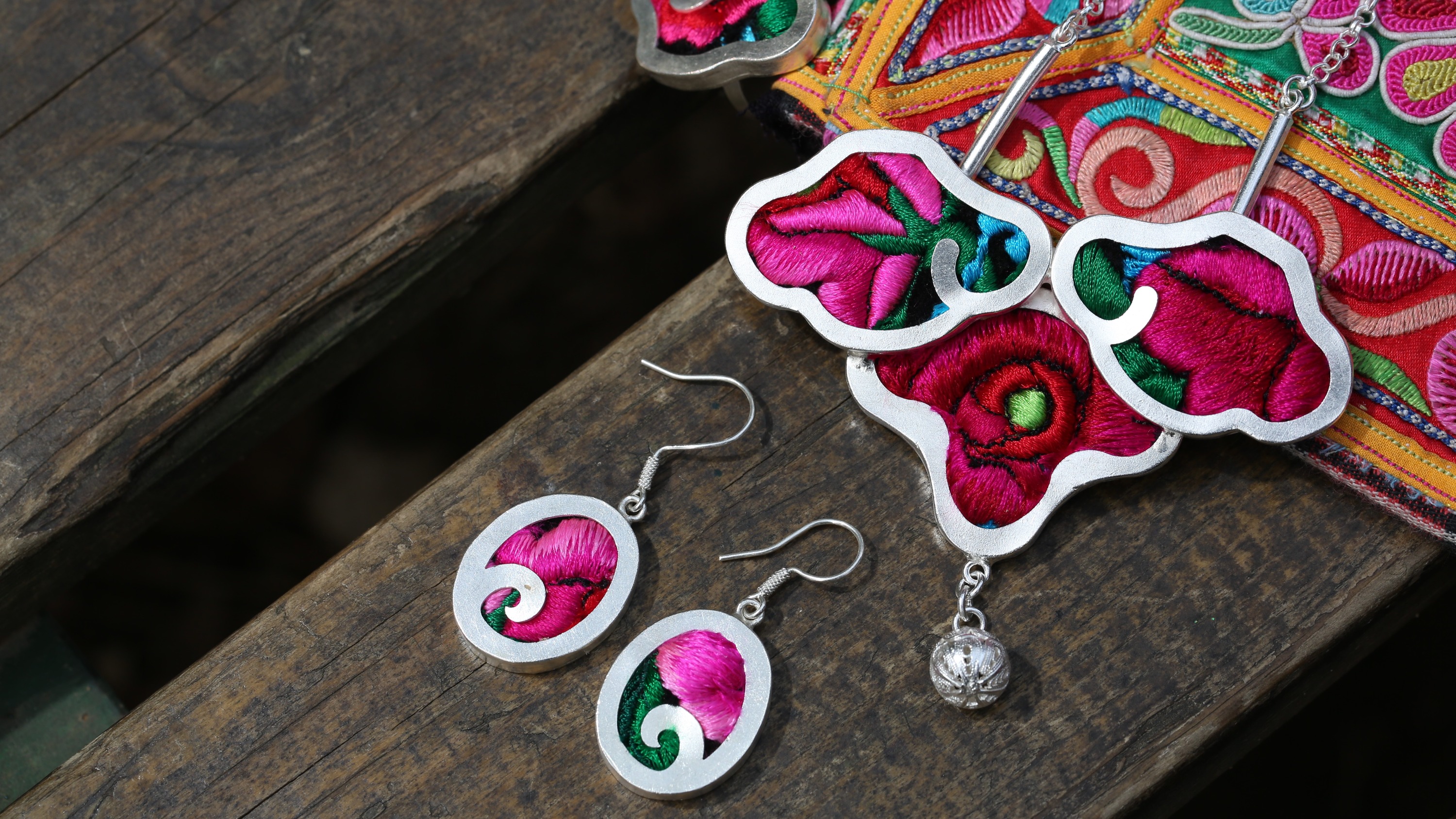 潘锦从小就喜欢银饰产品,最开始是单纯地热爱它“美的声音”和“美的造型”,后来成立工作室,把银和绣结合创意创新推出新的饰品。作为贵阳市非物质文化遗产银饰传承人,潘锦在2018年加入省妇联“锦绣计划”,得到政府大力支持和推广,还被选入“锦绣计划”非物质文化遗产智库专家、贵阳市十佳巾帼锦绣之星等。曾带着自己创新的银饰作品前往洛阳、长沙、意大利、美国、匈牙利、奥地利、捷克等地参加政府组织的推介会以及各类比赛。