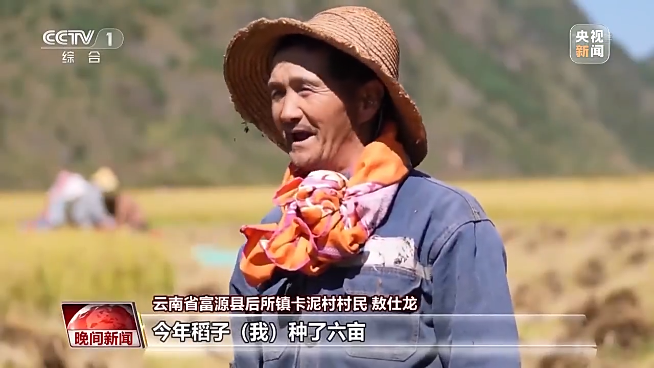云南省富源县后所镇卡泥村村民 敖仕龙:今年稻子种了六亩,一亩收得到二十口袋,这个稻子比去年饱满,比去年称得出来(重),价格也比去往年好点。