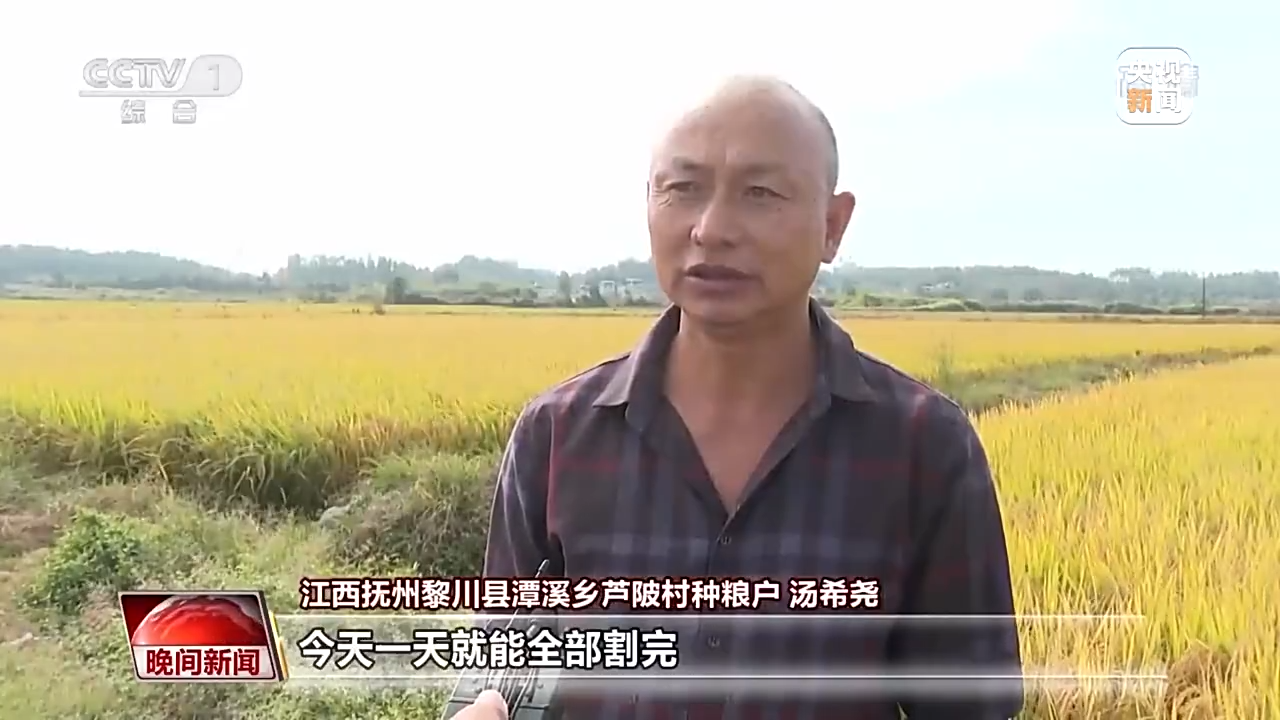 江西抚州黎川县潭溪乡芦陂村种粮户 汤希尧:按照这个速度今天一天就能全部割完。今年晚稻的长势还算不错,亩产都在千斤以上。