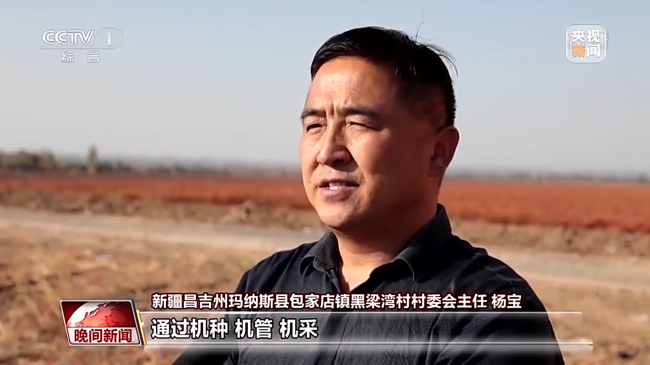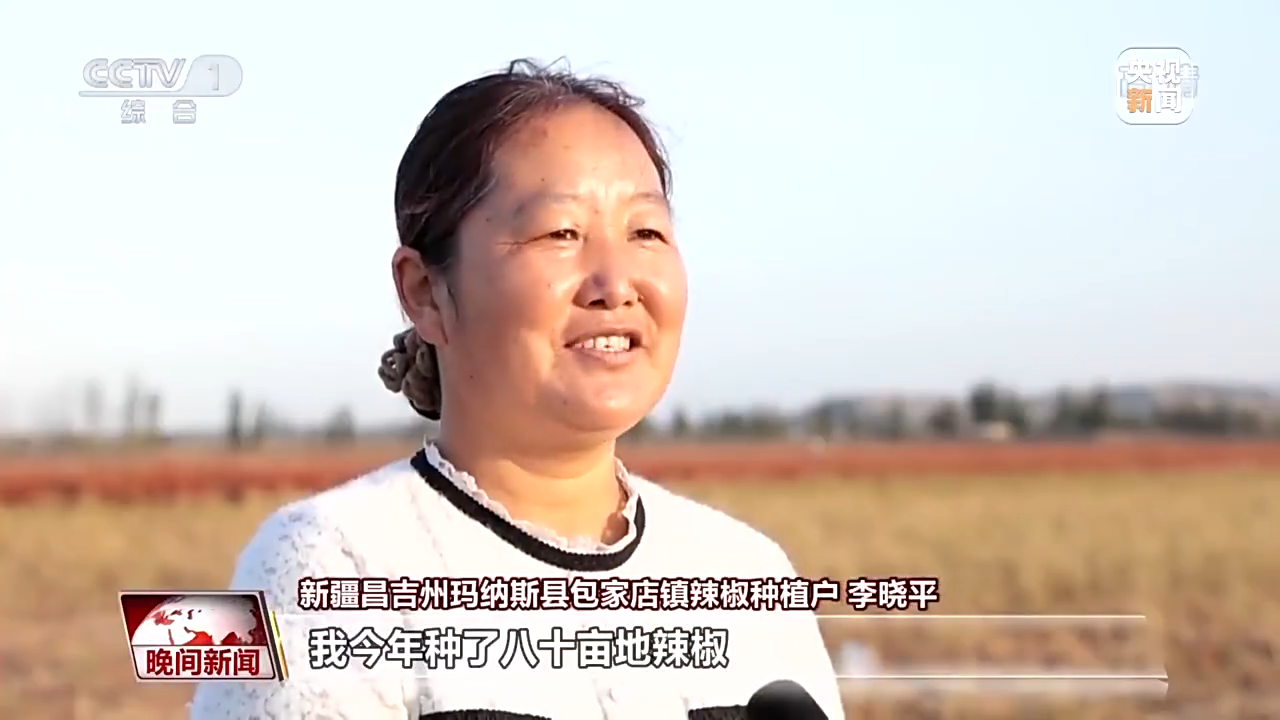 新疆昌吉州玛纳斯县包家店镇辣椒种植户 李晓平:我今年种了八十亩地辣椒,现在正在机械采收,以前种这么多地,要最少得十天才能采收,现在机械采收省事、省力。