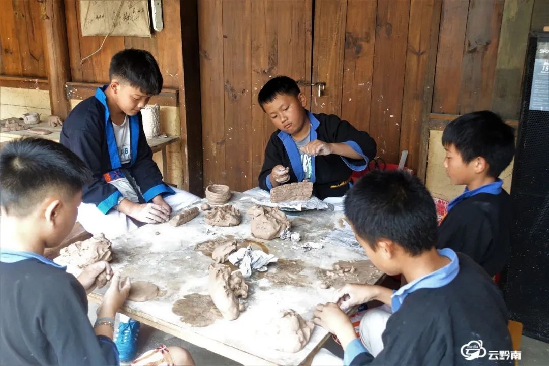 在荔波县瑶山古寨景区的陶艺工坊,身着青白相间瑶族传统服饰的荔波县瑶山民族小学学生们围桌而坐,制作泥料、拉坯成型、坯体干燥……孩子们在“第二间教室”里,于模仿与实践中传承文化,在学校老师莫余香的指导下,合作体验、独立思考、自由创新,真正成为课堂主角。