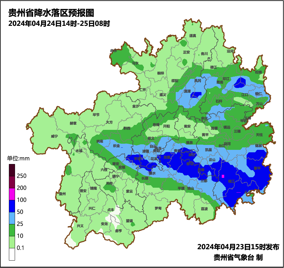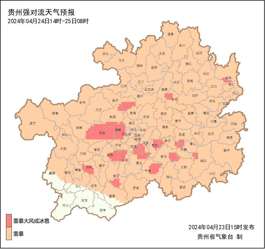 今天(4月23日),记者从省气象台获悉,根据最新气象资料分析,明天午后至夜间,省的西南部地区多云有分散阵雨或雷雨,其余地区阴天间多云转阵雨或雷雨,中东部地区有中到大雨,局地有暴雨,个别乡镇有大暴雨,中南部局地伴有冰雹、雷暴大风、短时强降水等强对流天气,贵阳市受强对流及较强降水影响的区域为中南部,时段为24日17时至25日05时;此次过程累计降水量最大可达90~120毫米,最大小时雨强为40~60毫米/小时。