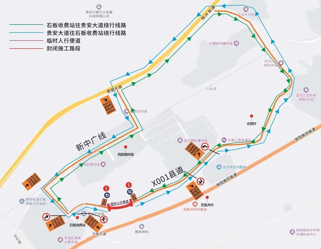 二、临时交通管制期间,由石板收费站、花石路往返西部石材城、合朋村、花鱼村方向的车辆由新中广线、贵安大道辅路绕行。