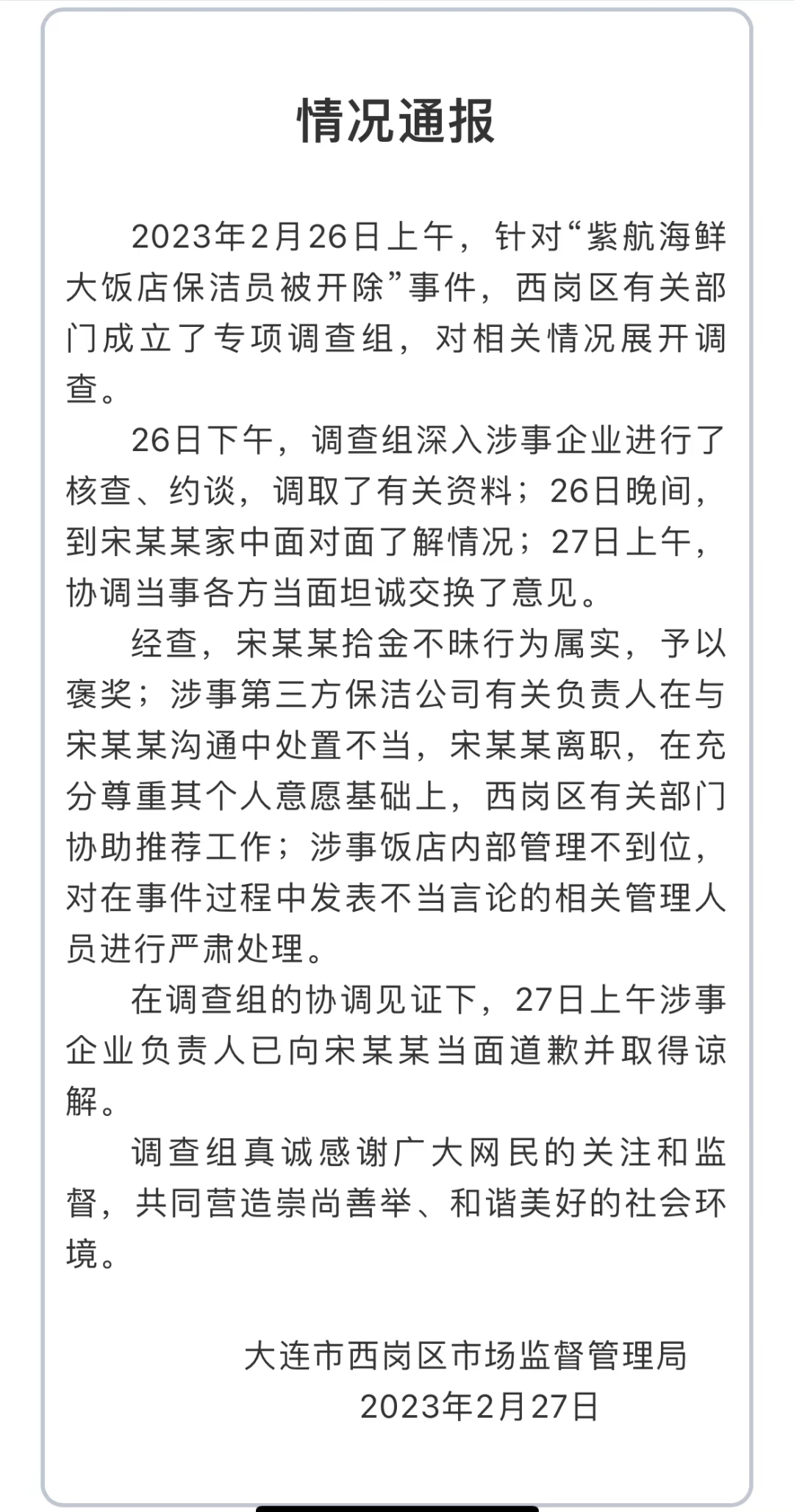 27日下午,大连市西岗区市场监督管理局发布情况通报。通报称,经查,宋某某拾金不昧行为属实,予以褒奖;涉事第三方保洁公司有关负责人在与宋某某沟通中处置不当,宋某某离职,在充分尊重其个人意愿基础上,西岗区有关部门协助推荐工作;涉事饭店内部管理不到位,对在事件过程中发表不当言论的相关管理人员进行严肃处理。调查组的协调见证下,27日上午涉事企业负责人已向宋某某当面道歉并取得谅解。通报内容如下: