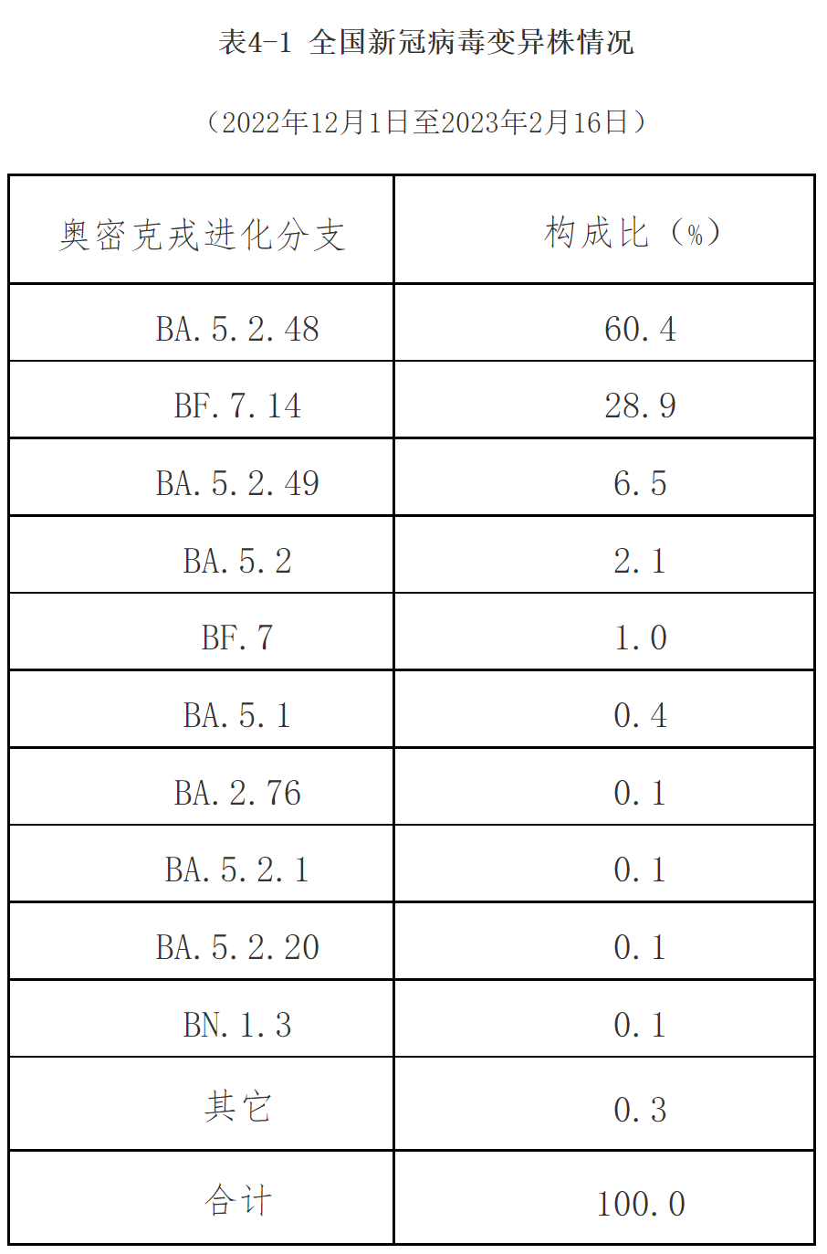 (二)12月以来本土病例病毒变异株监测情况。2022年12月1日至2023年2月16日,全国共报送16931例本土病例新冠病毒基因组有效序列,全部为奥密克戎变异株,共存在34个进化分支。主要流行株为BA.5.2.48(60.4%)和BF.7.14(28.9%)(表4-1)。共发现本土重点关注变异株15例,其中,1例XBB.1,1例XBB.1.5,1例BQ.1,5例BQ.1.1,1例BQ.1.1.17,4例BQ.1.2和2例BQ.1.8。