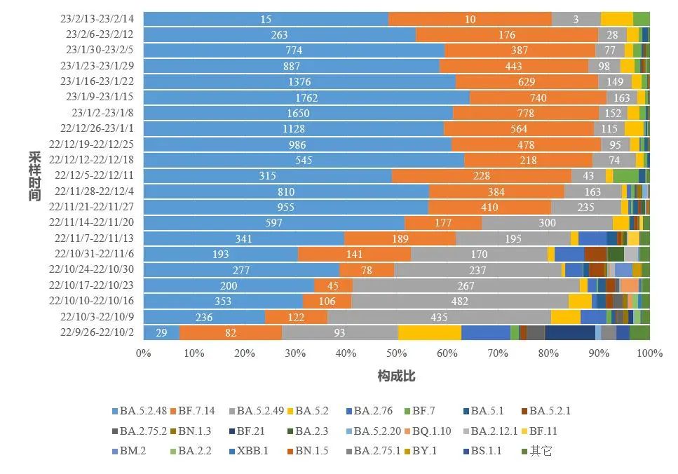 2.图中标记的数字分别为BA.5.2.48、BF.7.14和BA.5.2.49进化分支有效基因组序列数量。