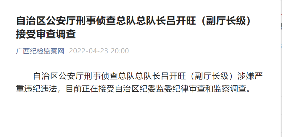 记者4月23日从“广西纪检监察网”微信公众号获悉,广西壮族自治区公安厅刑事侦查总队总队长吕开旺(副厅长级)涉嫌严重违纪违法,目前正在接受自治区纪委监委纪律审查和监察调查。