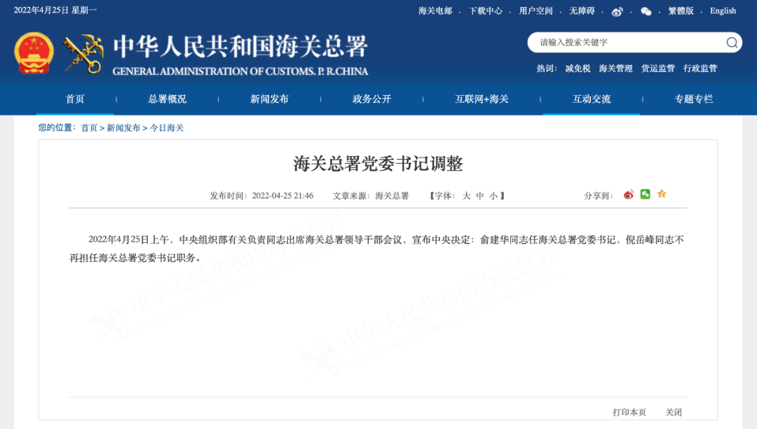 据海关总署官网消息,4月25日上午,中央组织部有关负责同志出席海关总署领导干部会议,宣布中央决定:俞建华同志任海关总署党委书记,倪岳峰同志不再担任海关总署党委书记职务。
