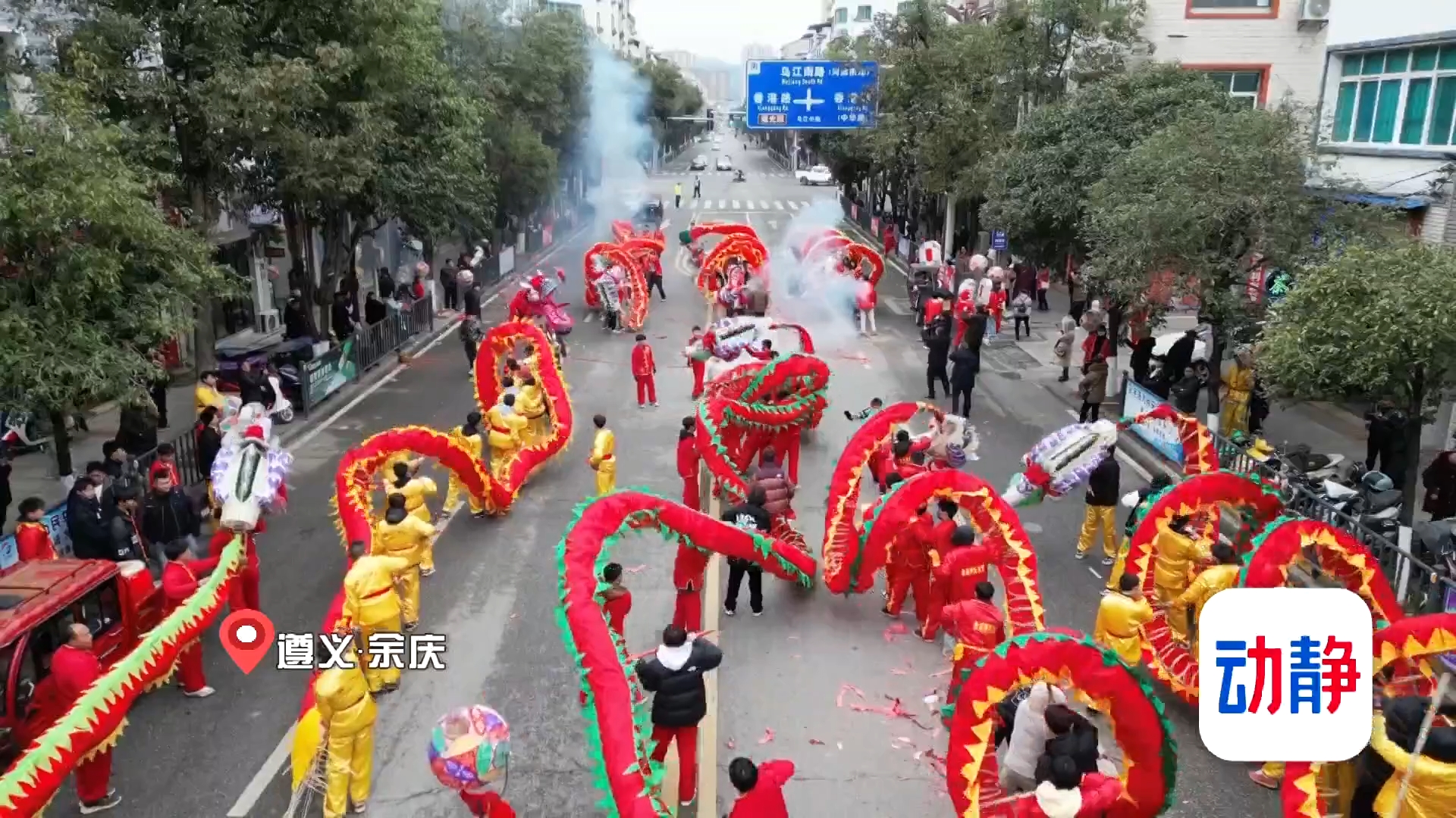 在余庆,六条长龙在大街上上下翻飞,人们将鞭炮不断地丢向长龙。随着炸龙的鞭炮声越来越猛烈,舞龙人越舞越狂野,长龙在街道上来回游走,场面气势恢宏,吸引了众多游客参与其中,体验民俗乐趣。