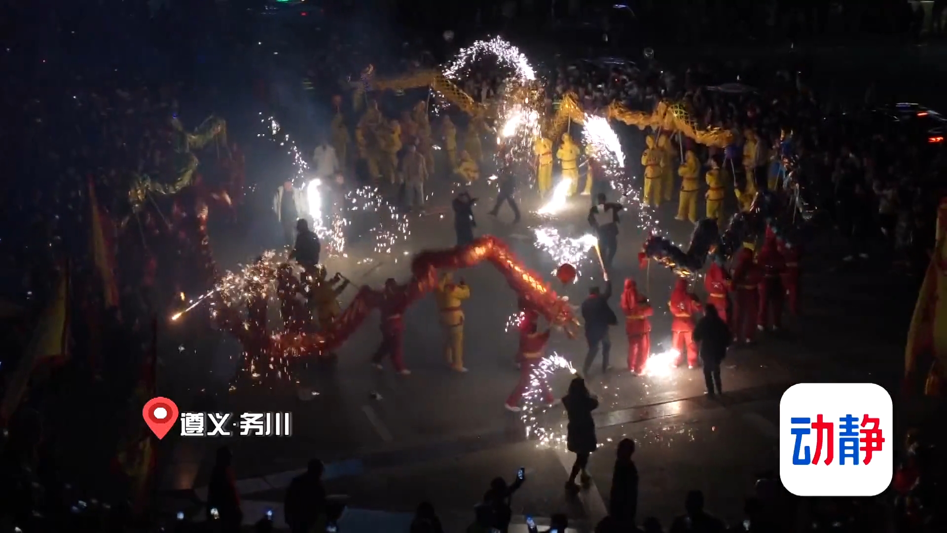 在遵义市务川县,四条长龙在舞龙队的控制下一路“蜿蜒”巡游,时而奔腾,时而穿梭,生动活泼,行进至广场处,长龙围成圈,在鞭炮和火化中上下飞舞。