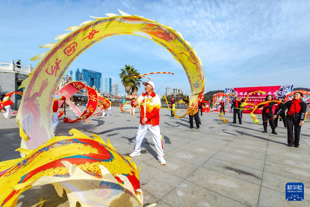 2月12日,舞龙爱好者在贵州省安顺市西秀区虹山湖公园进行舞彩龙表演。
