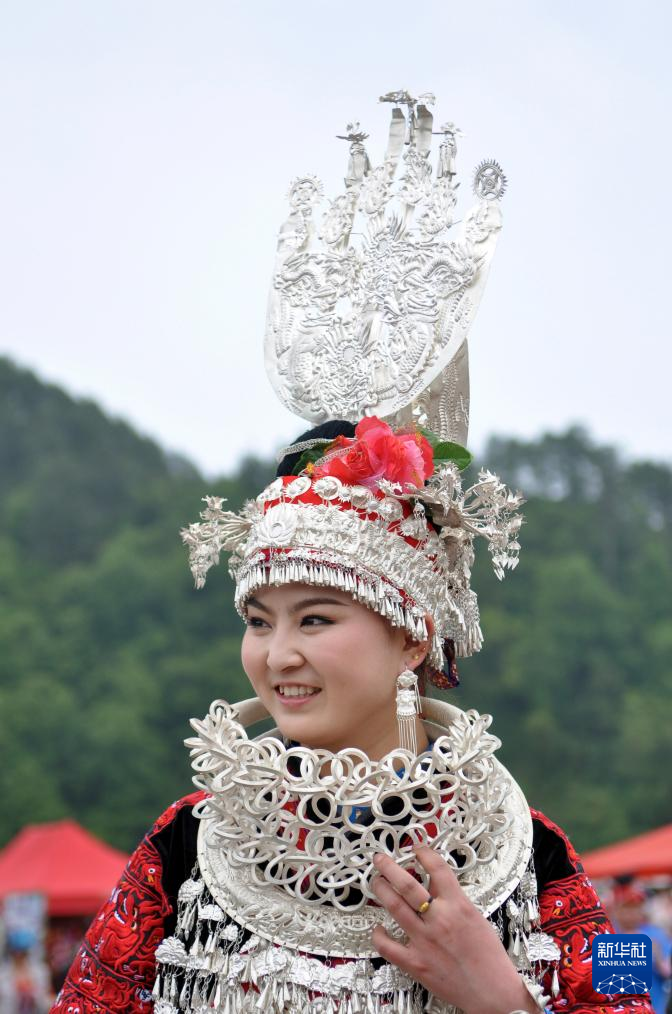 2月12日,在贵州省黔东南苗族侗族自治州台江县施洞镇偏寨村,苗族姑娘戴着龙图腾的银冠去参加跳芦笙民俗活动。新华社发(吴吉斌 摄)