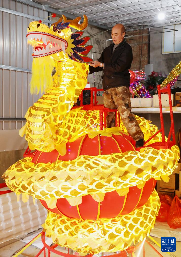 2月12日,在贵州省黔东南苗族侗族自治州施秉县城东社区,民间艺人抓紧制作创意龙花灯。新华社发(邰胜智 摄)