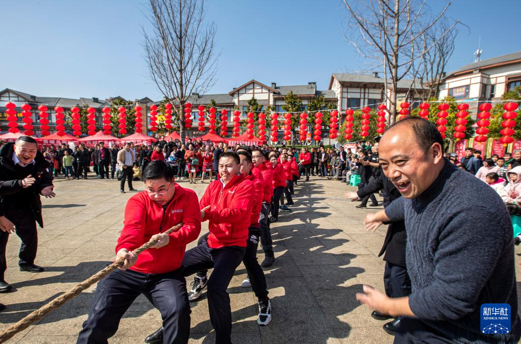 1月31日,在贵州省黔西市锦绣街道锦绣花都易地扶贫搬迁安置点,搬迁群众开展拔河比赛。新华社发(史开心 摄)
