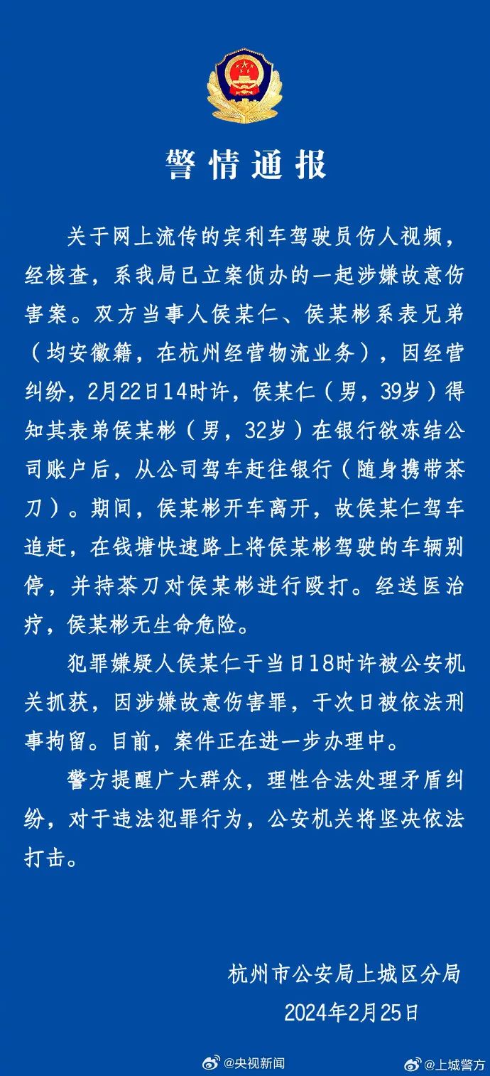 关于网上流传的宾利车驾驶员伤人视频,经核查,系我局已立案侦办的一起涉嫌故意伤害案。双方当事人侯某仁、侯某彬系表兄弟(均安徽籍,在杭州经营物流业务),因经营纠纷,2月22日14时许,侯某仁(男,39岁)得知其表弟侯某彬(男,32岁)在银行欲冻结公司账户后,从公司驾车赶往银行(随身携带茶刀)。期间,侯某彬开车离开,故侯某仁驾车追赶,在钱塘快速路上将侯某彬驾驶的车辆别停,并持茶刀对侯某彬进行殴打。经送医治疗,侯某彬无生命危险。