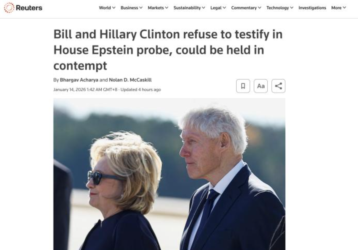 据路透社报道,当地时间13日,美国前总统比尔·克林顿及妻子、前国务卿希拉里·克林顿拒绝在共和党主导的国会针对爱泼斯坦的调查中作证,称该调查是党派斗争行为。