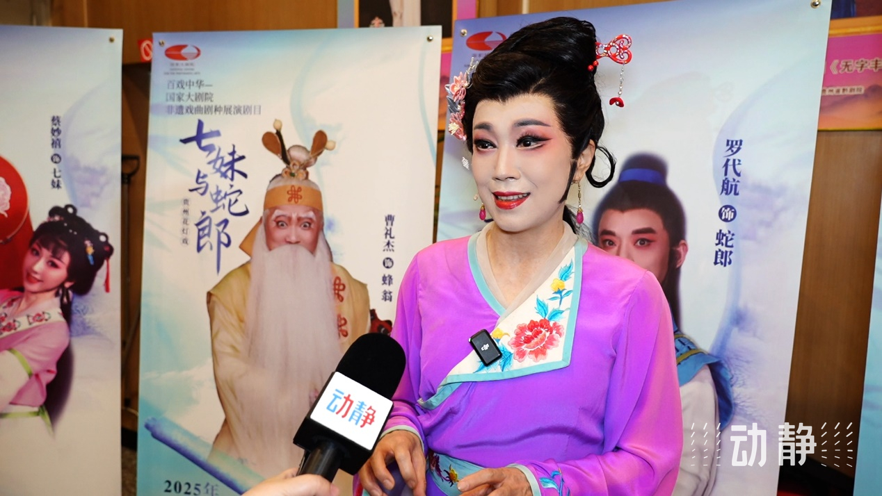 “37年前我在剧中演的是大姐,后来又演了七妹,包括里边几个姐妹的角色我都饰演过,对于这部剧有着深厚的情感。” 中国戏剧梅花奖获得者、国家级非物质文化遗产贵州花灯戏代表性传承人、贵州花灯戏邵派旦角表演艺术创始人邵志庆介绍,《七妹与蛇郎》是传统的花灯戏剧目,从民间走到高端平台。台上,不仅有她与弟子蔡妙禧,还有花灯戏非遗传承班毕业的“花四代”青年演员,映照出非遗薪火相传、“灯灯”不熄。