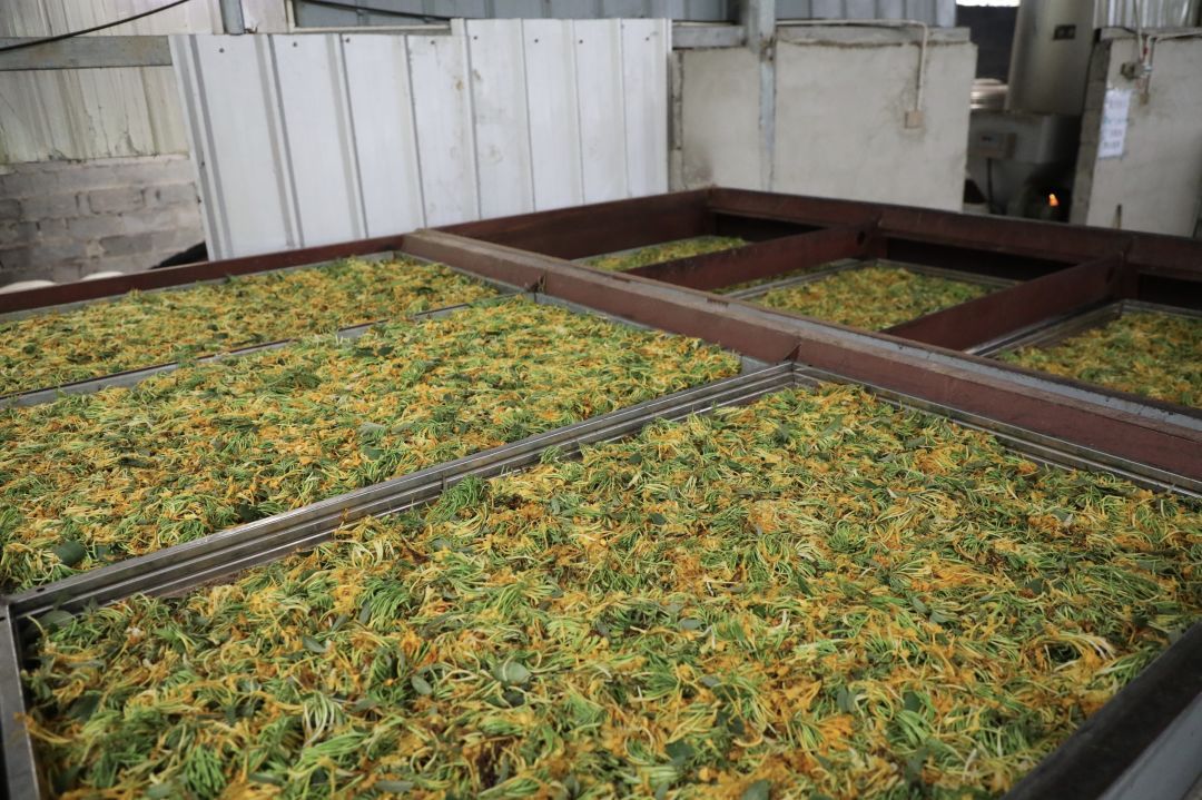 经过一上午的忙碌,梁昌奎和村民们收获鲜花百余斤,跟随着他的脚步,记者来到飞水村的金银花加工厂,随着金银花的首茬开采,加工厂的机器不停运转轰鸣,火力全开,工人们正忙着烘干刚摘回来的金银花,整个工厂内弥漫着浓浓的金银花香。