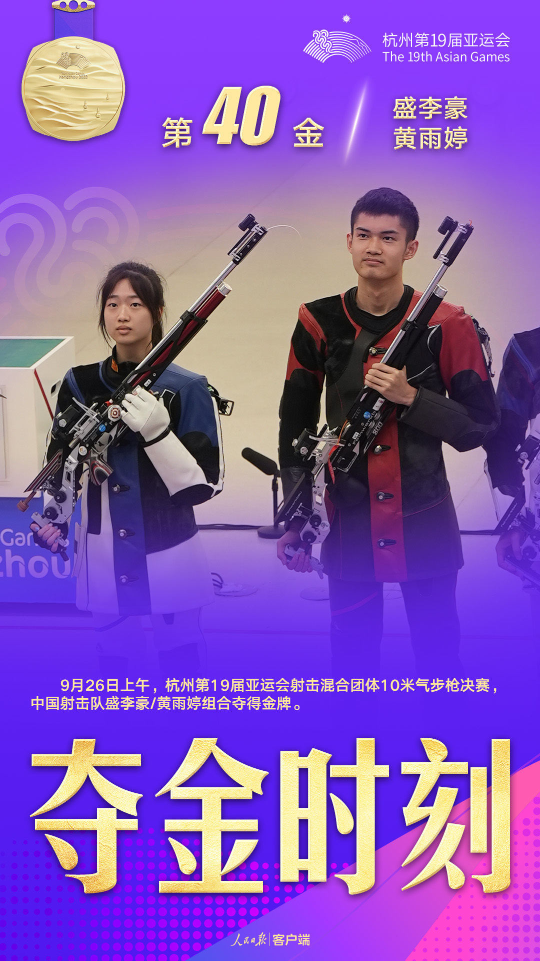 9月26日,杭州亚运会10米气步枪混合团体,中国射击队盛李豪/黄雨婷组合夺得金牌。
