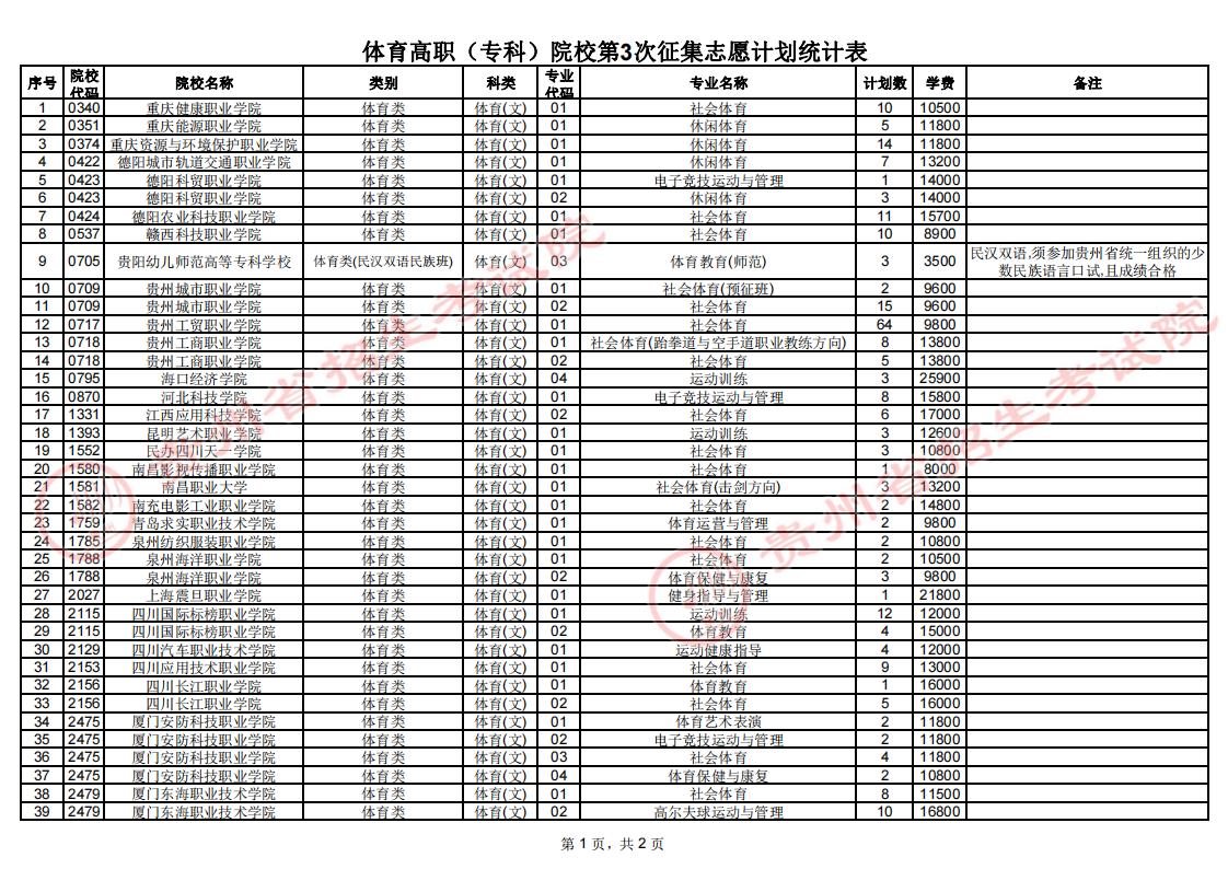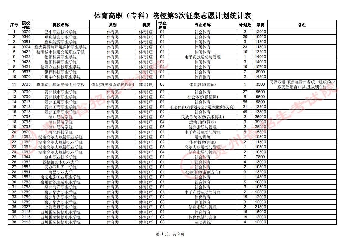 体育类高职(专科)院校第2次征集志愿投档录取后,部分院校因生源不足和考生身体条件不符合院校招生章程要求而退档,尚有部分剩余计划,将在网上征集志愿。具体说明如下: