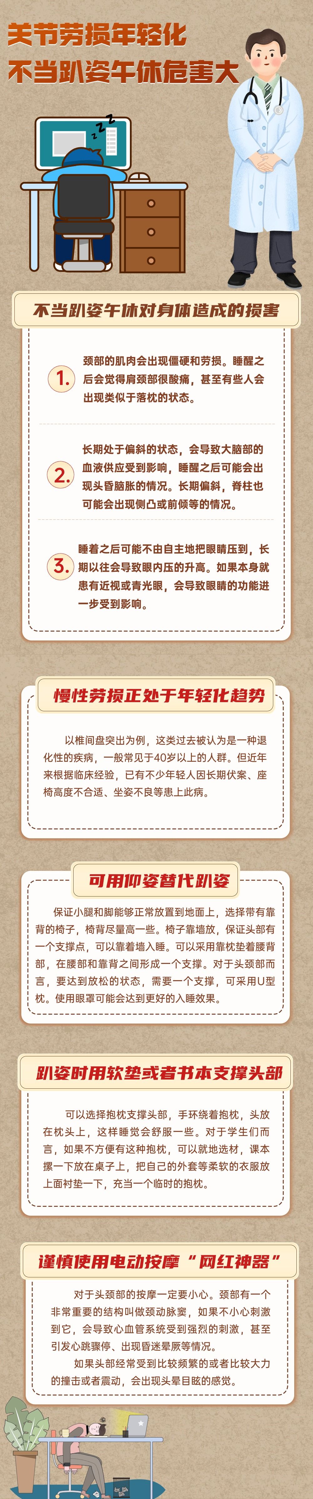 “中午不睡,下午崩溃”,面对时而劳累的工作和学习,趴着午睡很方便,但不良的生理曲度,会直接加重腰椎、颈椎劳损。九月来临,各个学校开学,初入职场的毕业生们渐入正轨,午休是工作、学习中放松休息的常见方式。武汉市第四医院的骨科医生李亚楠介绍,颈椎、腰椎的慢性劳损,目前处于年轻化的趋势。医生建议,坐姿午休时可用仰姿代替趴姿,如果只能趴着,需用软垫或者书本支撑头部。同时,电动按摩“网红神器”有可能会直接损伤神经,应谨慎使用。