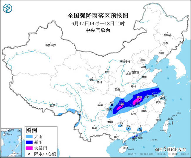预计,6月17日14时至18日14时,河南南部、苏皖大部、上海北部、湖北、湖南北部、江西北部、重庆、贵州北部,以及广西北部、广东中南部、云南西部、西藏东南部等地部分地区有大到暴雨,其中,湖北东部和西南部、湖南西北部、重庆东南部、河南南部等地部分地区有大暴雨(100~200毫米)。上述部分地区伴有短时强降水(最大小时降雨量20~60毫米,局地可超过70毫米),局地有雷暴大风等强对流天气。